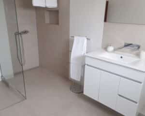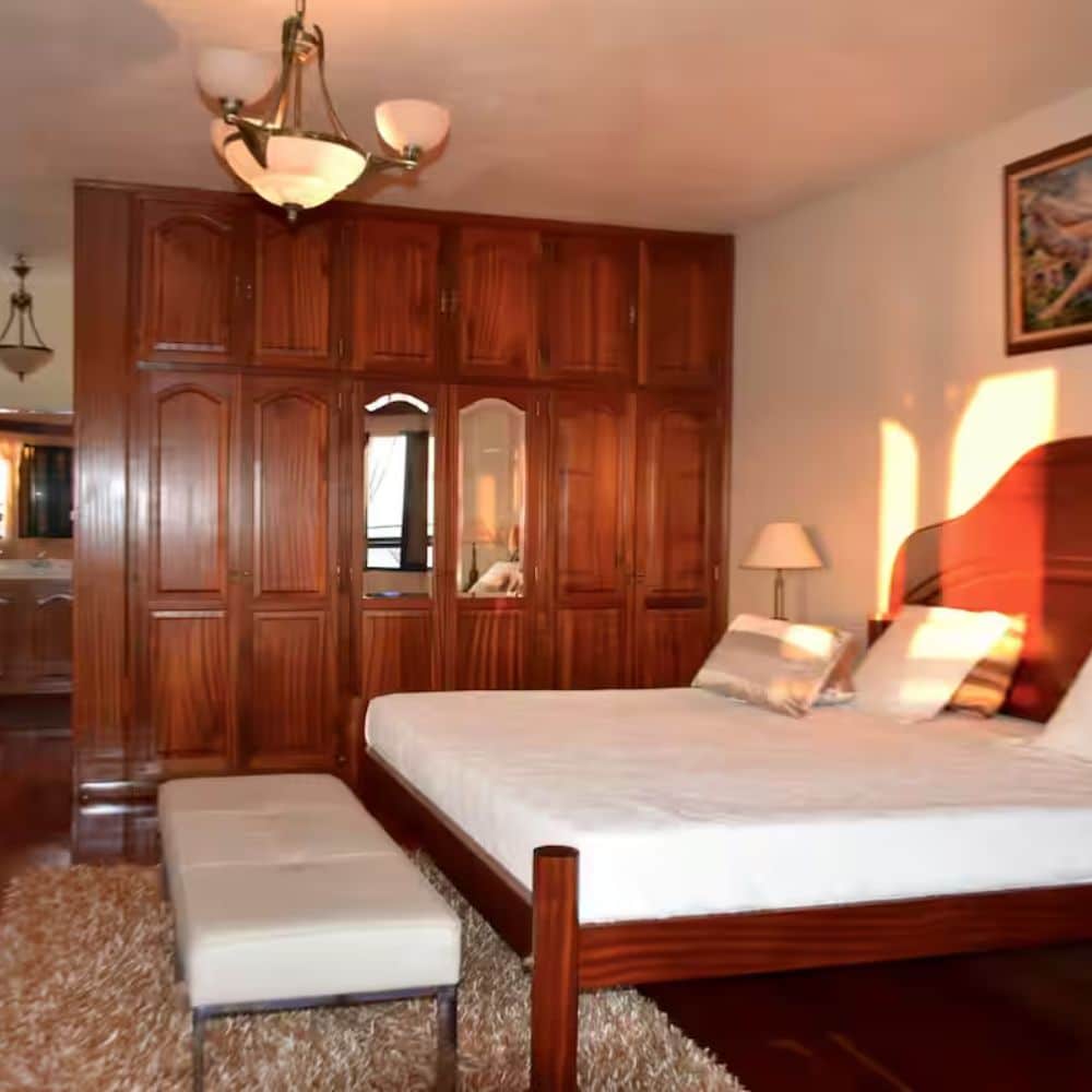 Großzügiges Schlafzimmer mit Doppelbett und eigenem Badezimmer im Haus am Meer.