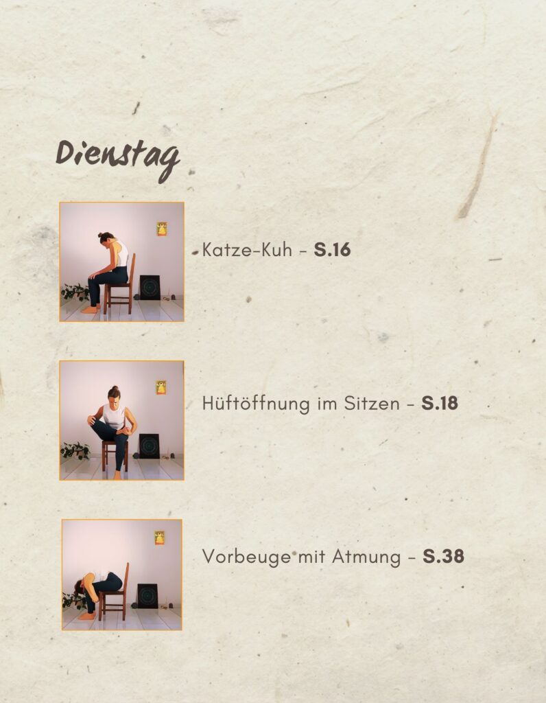 Der Plan basiert auf meinem Buch „Abnehmen mit Stuhl-Yoga“ und gibt dir eine klare Struktur für vier Wochen. Du integrierst täglich zwei bis drei kurze Übungen in deinen Tag – am Morgen, zwischendurch oder als ruhiges Abendritual. Alles findet im Sitzen statt und lässt sich leicht in den Alltag einbauen.